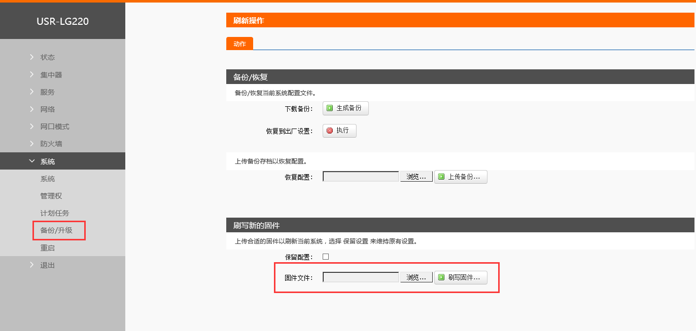 点击系统,选择备份/升级,选择固件文件,确定后点击刷写固件。
