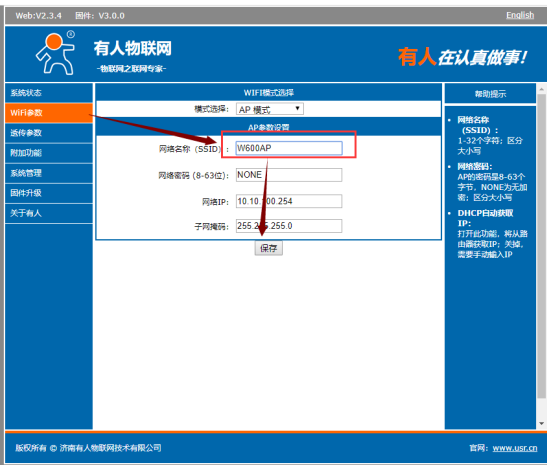 b. 打开WiFi参数,为了辨别设备作为ap的这个设备,给改下名称设置为W600AP,然后点击 确认 保存设置