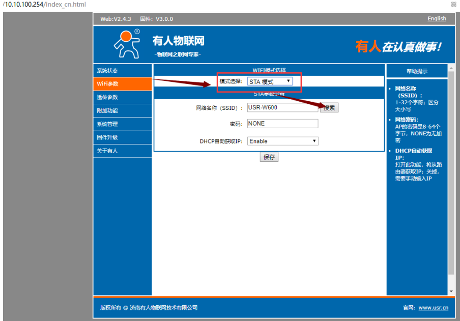 a.同样的,先加入模块的WIFI网络,登录10.10.100.254.
