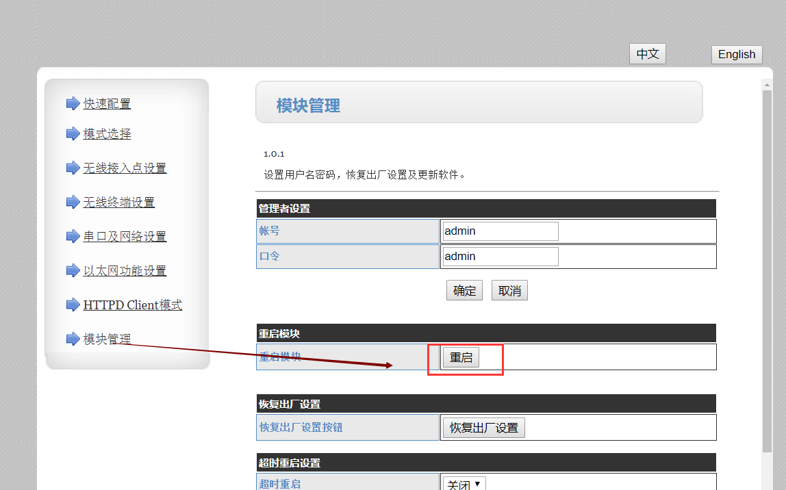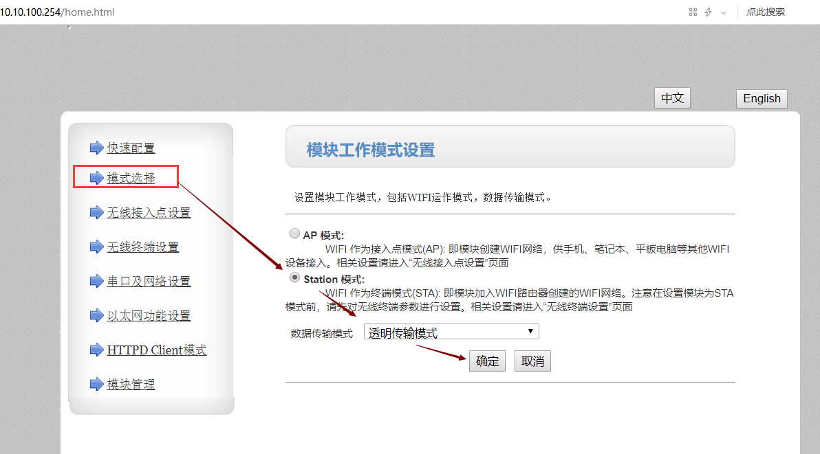 3、模式设置为 sta模式,数据传输为透明传输模式