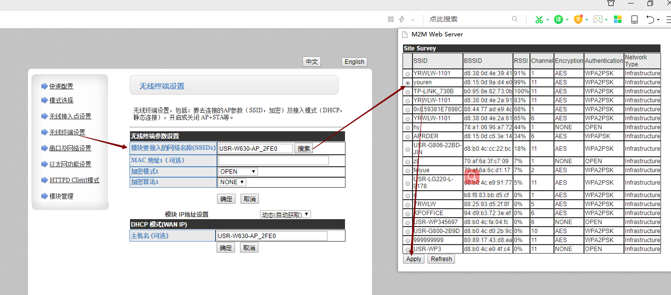 (1)进入无线终端配置,点击搜索,搜索路由器,选择要连接的路由器