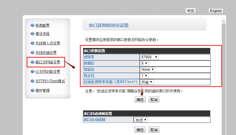 4、点击串口及网络设置,相应设置如下:(波特率可根据自己需要设置) 点击确定