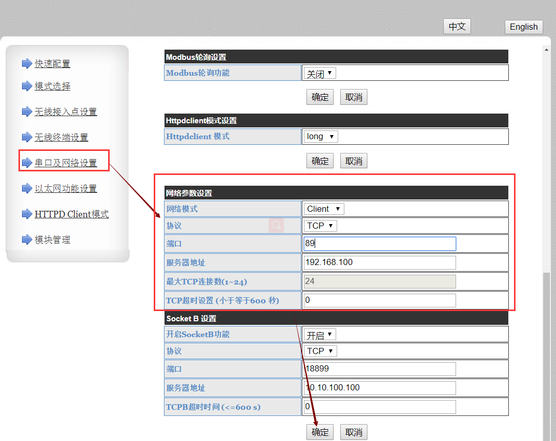 5.设置W630为tcp client协议,端口号是您服务器的端口号 点击确定
