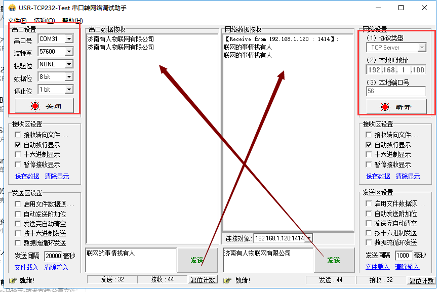 测试方法:打开有人串口转网络调试助手,参数配置如图