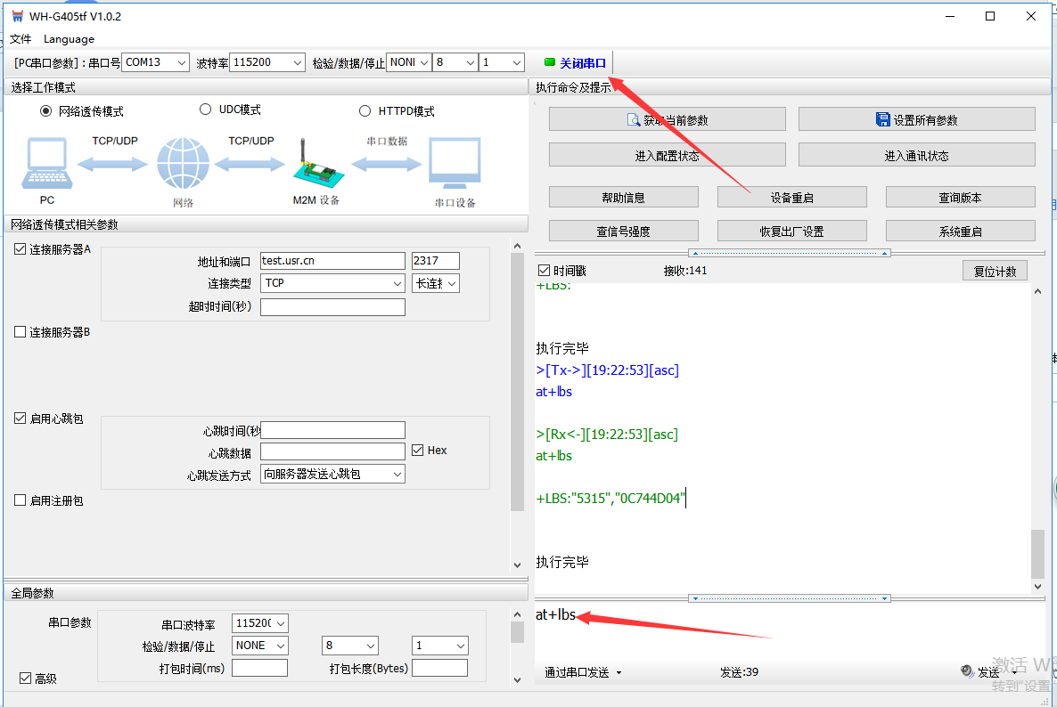 1.7S4放入sim卡,上电,串口连接电脑,打开配置软件,带7s4上电稳定后,点击打开串口,从发送框键入AT+LBS(回车换行),等待返回的数据,如图1.