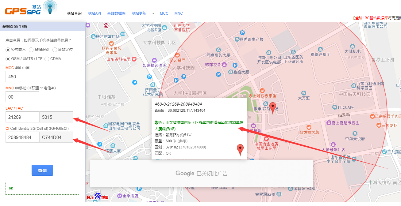 3. 打开网址:http://www.gpsspg.com/bs.htm,在LAC/TAC框内键入5315,在下面的框内键入C744D04(0C744D04开头为0,舍弃),点击查询,即可查询当前模块所在位置