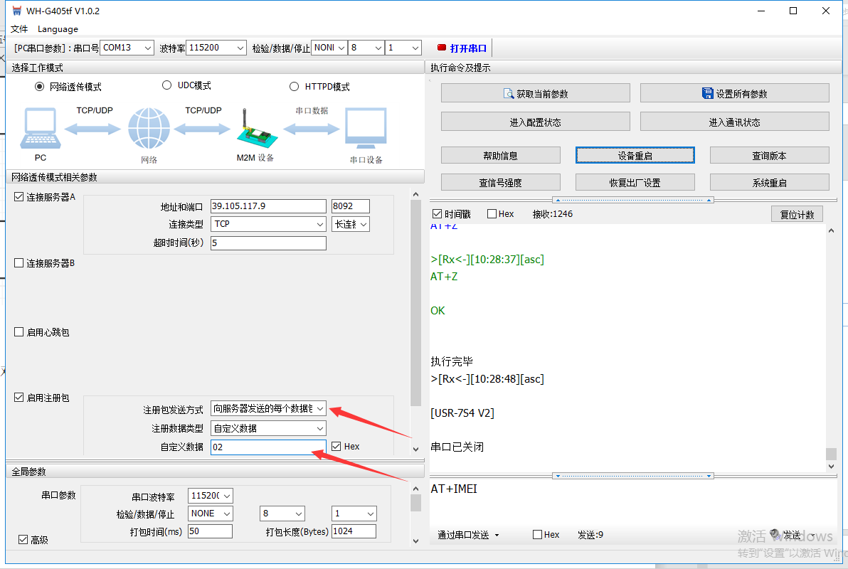 注:本案例中将注册包自定义为01和02,用户在真正使用过程中可以将注册包数据定义为任意数据,数据可设置最大长度依照具体设备的软件设计手册描述为准。
