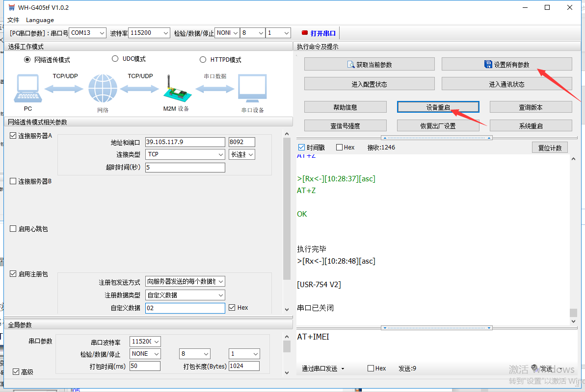 3. 配置好两个DTU之后点击设置所有参数,然后重启设备使参数配置生效,如图3