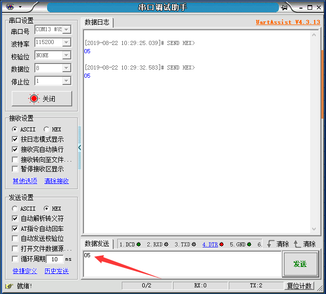 DTU2发送数据截图,发送数据为05,(所设注册包为02)如图4(2)所示: