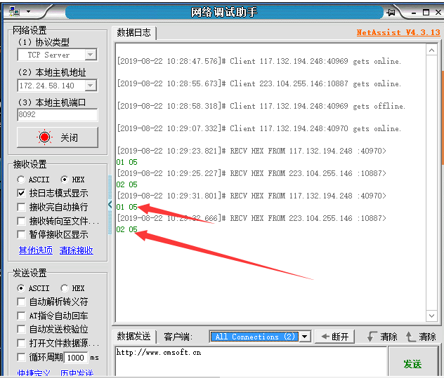 4. 连接服务器连接后,使用串口调试助手分别连接两个DTU,向服务器发送数据(此服务器为远程桌面临时测试服务器,用户在实际应用中应连接自己的服务器进行使用)。