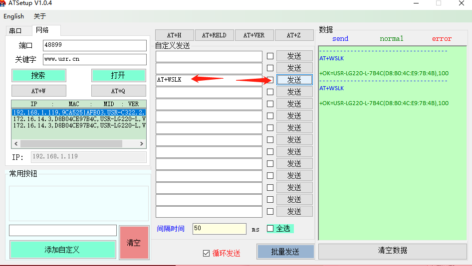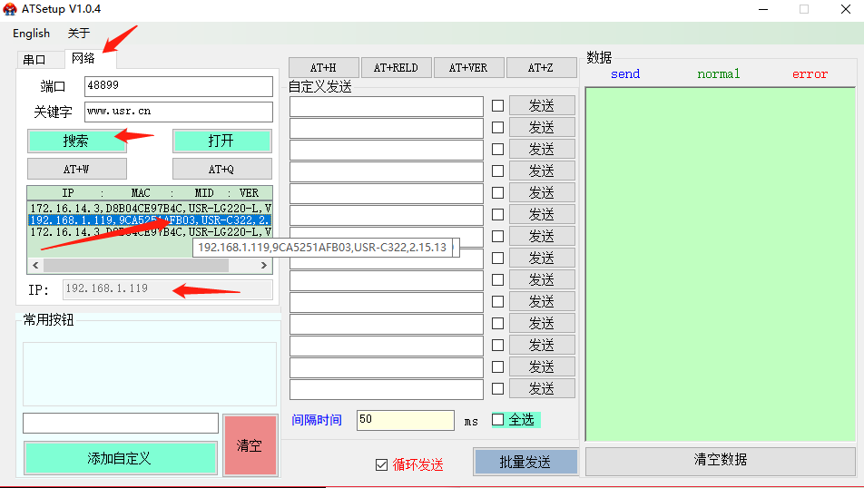 2) 打开ATSetup软件,选择“网络”,模块默认端口号:48899,关键字:www.usr.cn ,点击“搜索”会显示同一局域网内的该端口号与关键字的设备