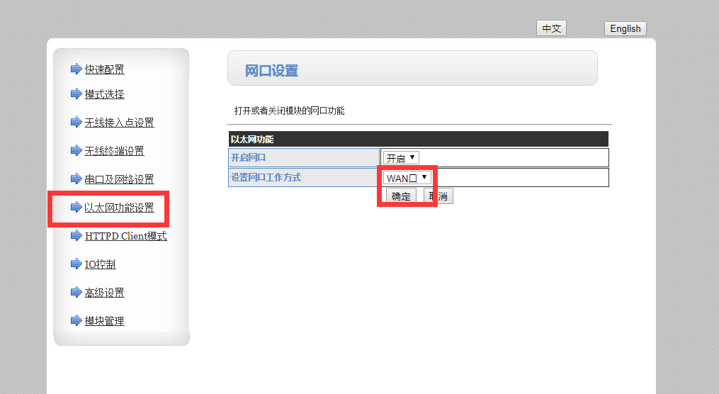 1、将模块的网口设置成WAN口去连路由器