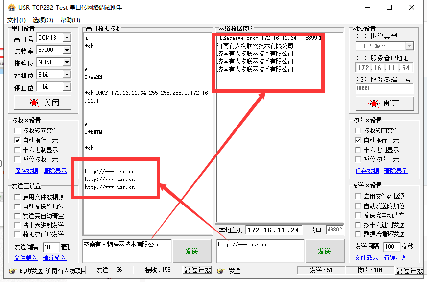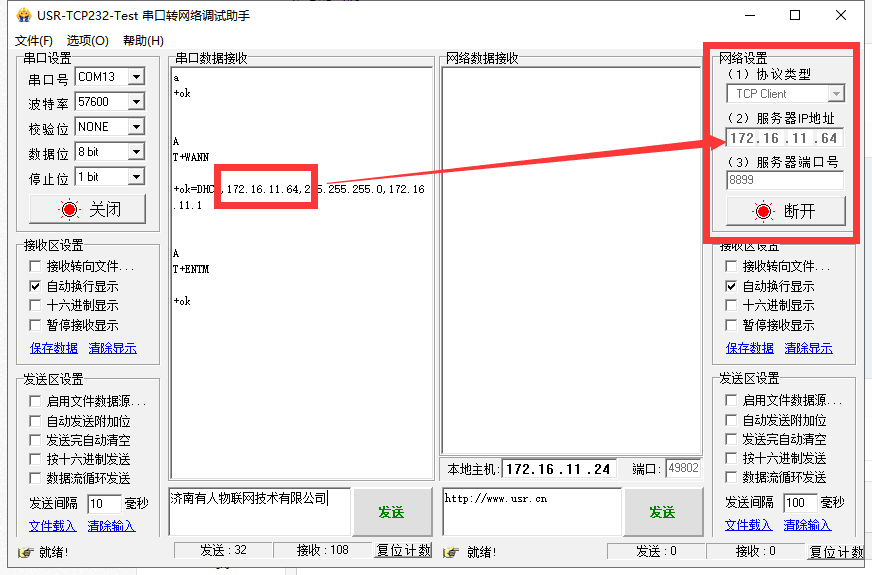 3、打开串口,用AT指令查询模块的WAN口IP,填写到PC2的服务器地址处,端口号写上面设置的端口号。