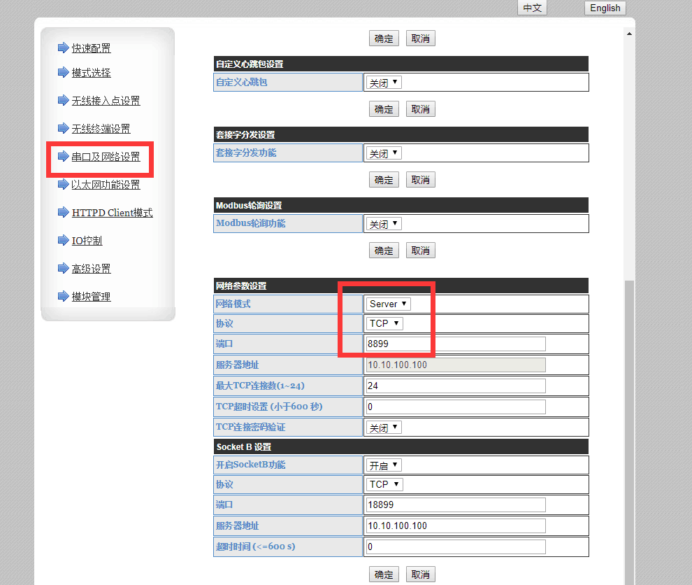 · 网络参数默认值:TCP,Sever,8899,10.10.100.254