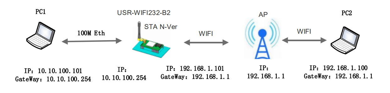 USR-WIFI232-B2 模块作为 STA(软件为 N-Ver),模块工作在路由模式。模块连到 AP 后,从 AP 处获得 IP 地址(如图 192.168.1.101)。模块本身组成一个子网(默认 10.10.100.254),以太网接口上的设备由模块分 配地址(如图 10.10.100.101)。这样如图 PC1 处于子网内(NAT),所以从 PC1 发起连接,可以连到 PC2 (因 为 USR-WIFI232-B2 工作在路由模式),但 PC2 不能主动连接到 PC1。