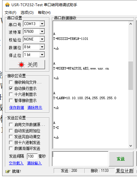(5) 设置模块要连接路由的 SSID 和密码(根据路由实际参数进行设置) 示例:AT+WSSSID=USR-WIFI-TEST AT+WSKEY=WPA2PSK,AES,www.usr.cn