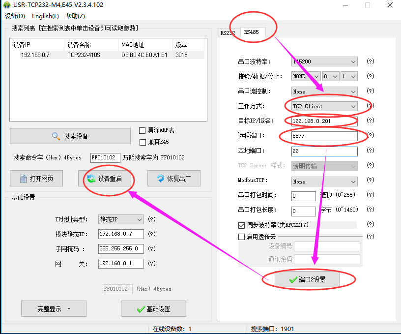 2. 打开设置软件USR-TCP232-M4-setup-V2.3.3.97,选择485的串口进行参数的配置,选中完后,设置相关的参数:工作方式设置为“TCP Client”,然后将目标的IP为:“192.168.0.201”然后将远程端口设置为“8899”.点击端口一设置,然后点击设备重启。