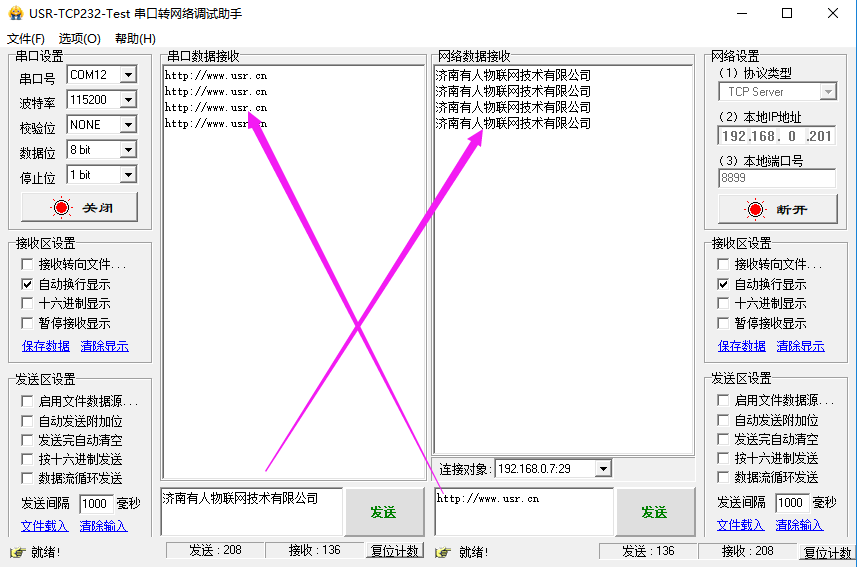 3. 打开测试软件:USR-TCP232-Test-V1.3,串口号可以在设备管理器中查询,然后本地端口可以写成“192.168.0.201”端口号是“8899”点击打开和监听按钮。相互发送数据。