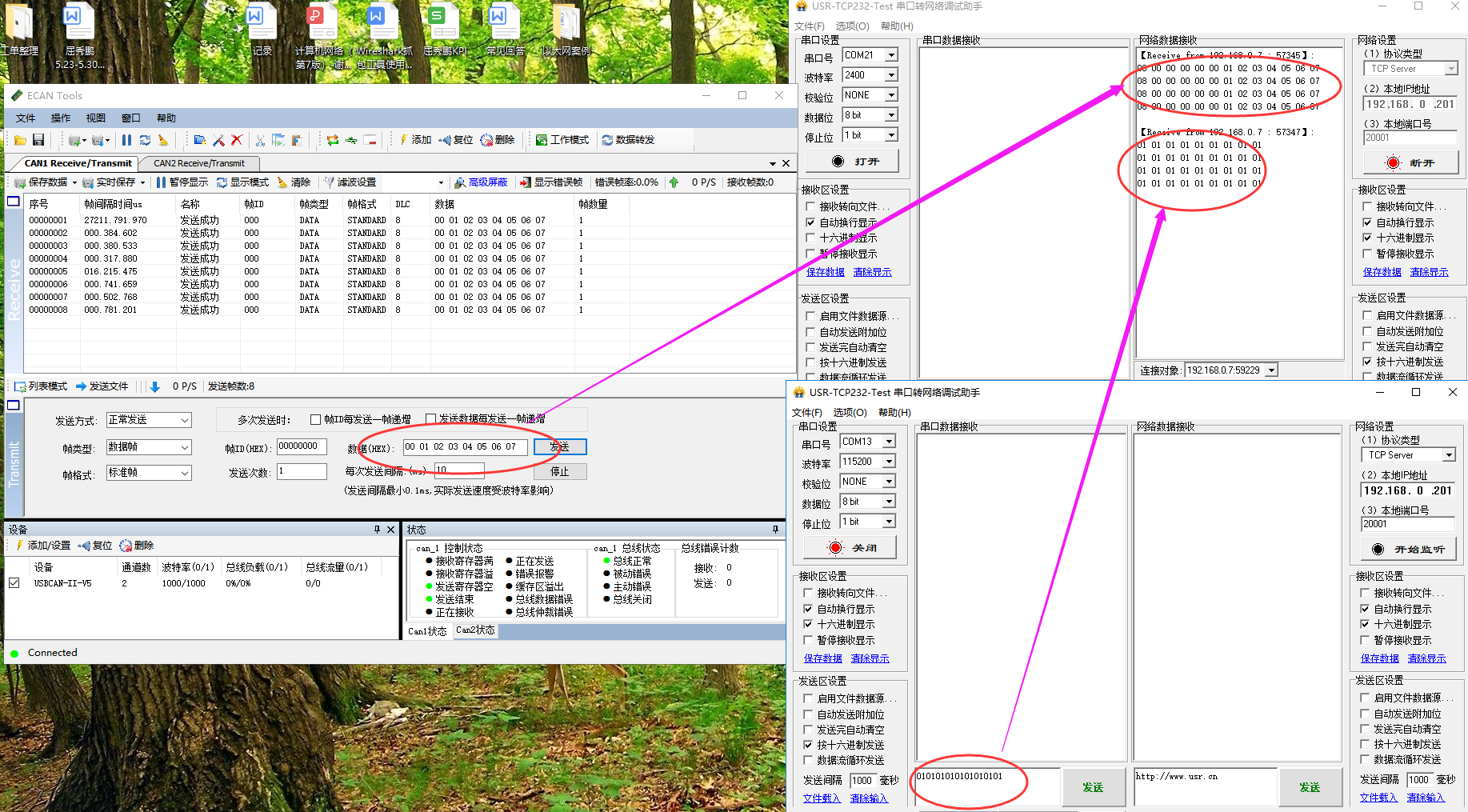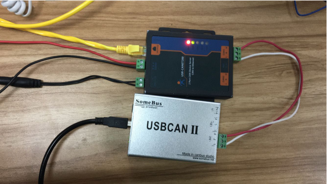 将设备USR-CANET200通过标准的适配器电源将设备上电,网线直连电脑。通过485转USB串口线将塞设备的485串口和电脑相连接,然后通过Can转USB串口线,将设备同电脑进行链接。