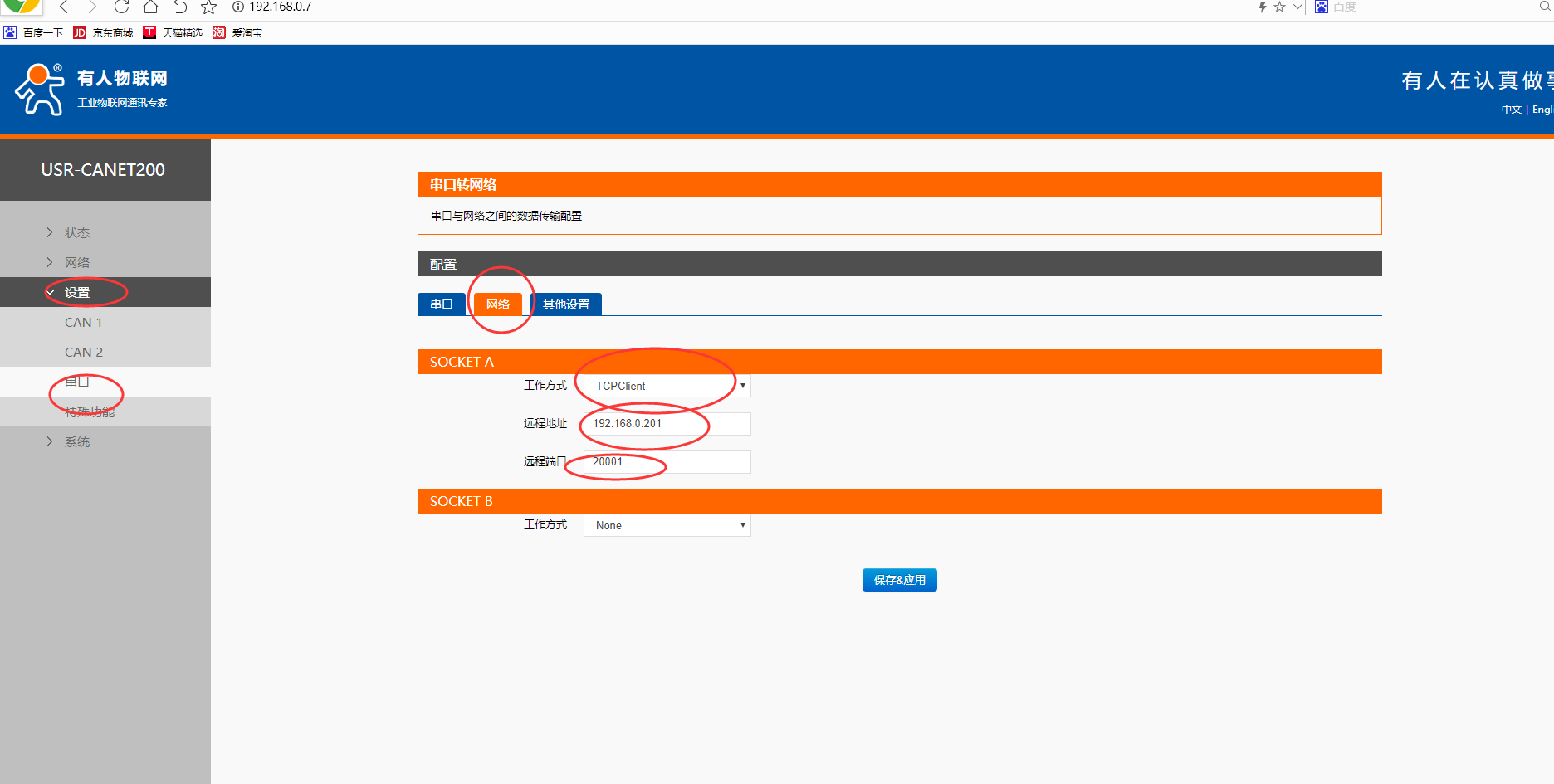 2. 设置Canet200相关的参数:(可以通过设置软件和内置网页两者均可,以下通过内置网页进行):打开浏览器,输入设备默认的IP地址:192.168.0.7 输入账号和密码(均为admin),点击设置面的Can1口(以1口为例),点击网络参数,设置工作方式为“TCP Client”,然后远程IP地址为:192.168.0.201(这是直连电脑的IP地址),端口号为“20001”设置完成后点击保存。