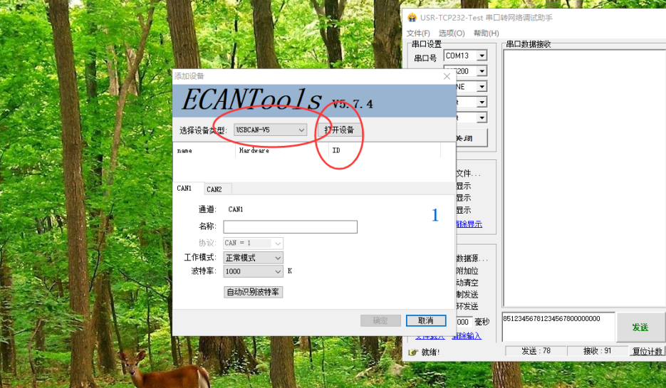 6. 然后通过Can工具,和485的串口向服务器发送数据,如图所示: