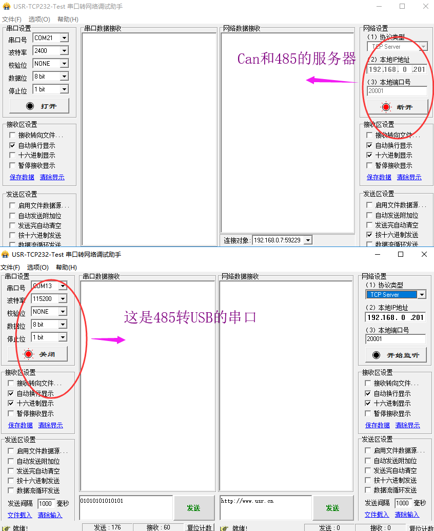5. 然后打开两个测试软件:USR-TCP232-Test-V1.3(一个是作为485串口接收端,一个作为Can和485的服务器),参数如图所示: