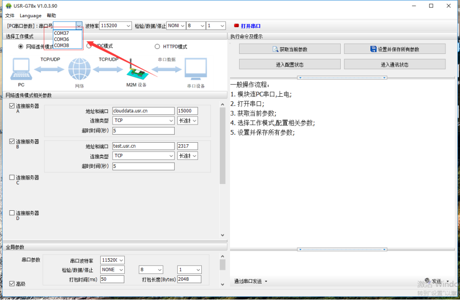 4.打开780软件,打开上一步在设备管理器中进行查看,显示的端口号为37和38,点一下软件的串口号的下拉框,可以看到有三个串口号,也就是除了37和38两个还有一个隐藏的,只是在设备管理器没显示,就选这一个没显示的串口号,波特率115200。