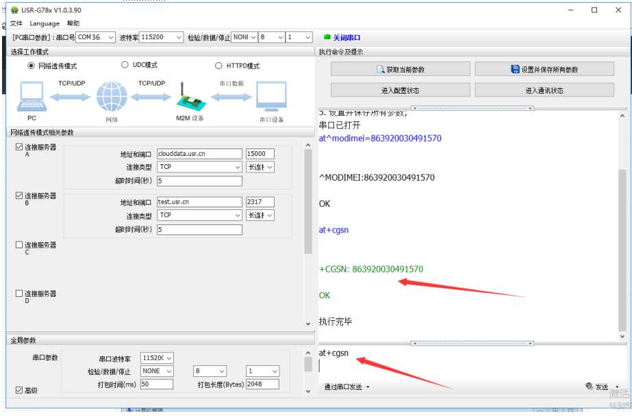 6. 再发送at+cgsn加回车,检查一下刚才发送的是否成功。如下图所示