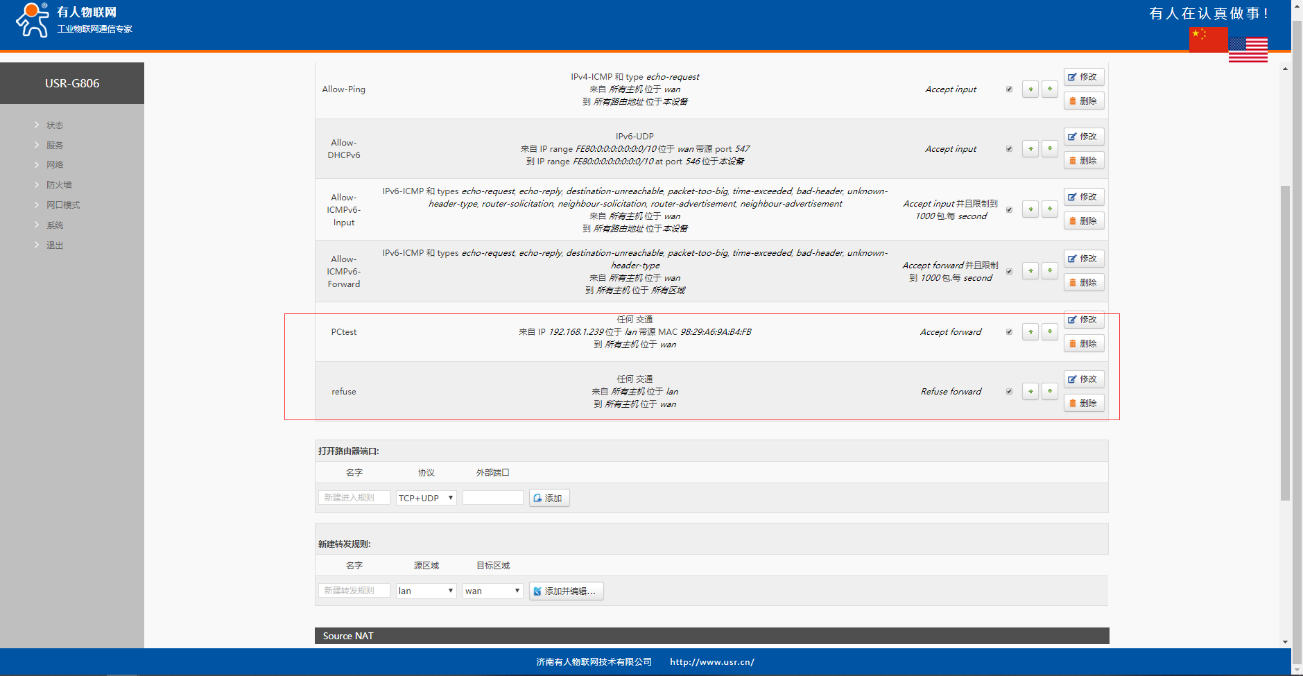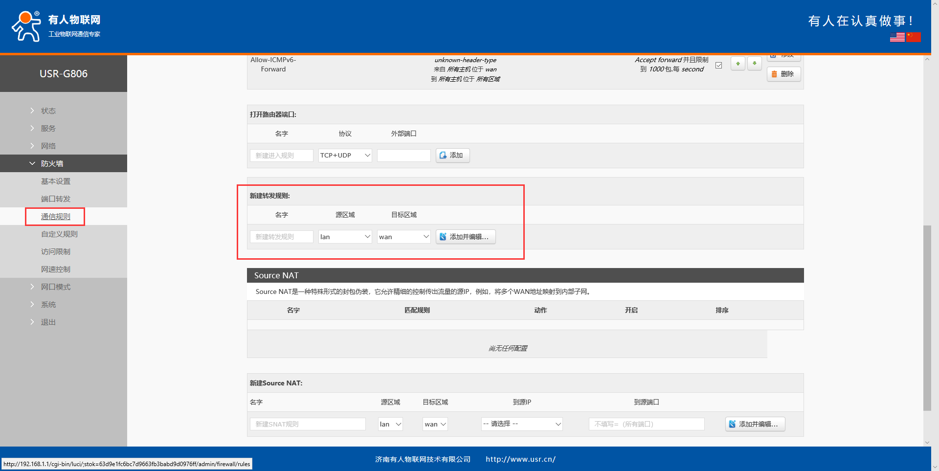 4、进入防火墙----通信规则界面,新建转发规则,自定义转发名称,选择源区域和目的区域后点击添加并编辑。