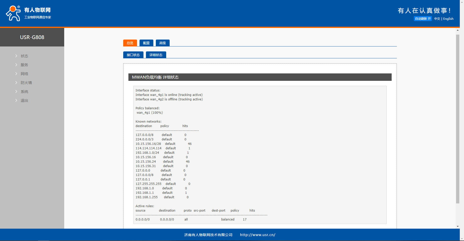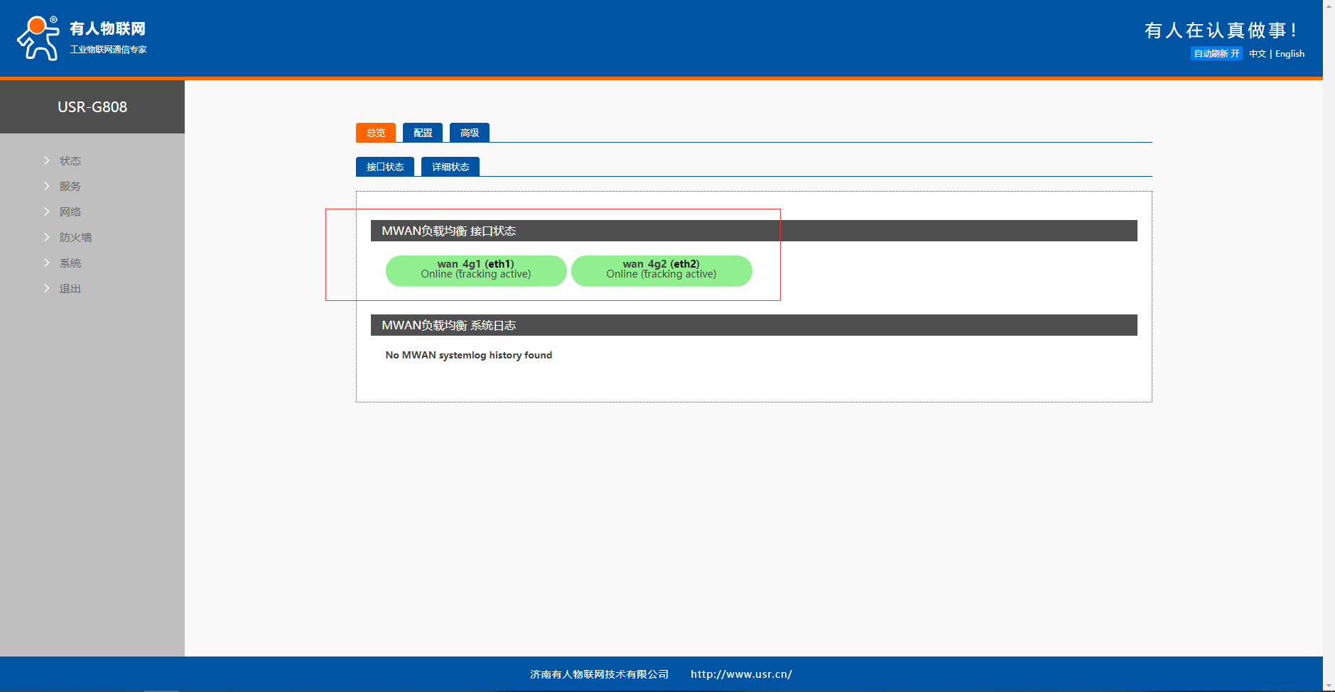 待设备重启完毕后,可以在总览里点击接口状态,发现两个接口变成绿色表示配置成功,红色表示没有成功。在详细状态里面可以看到两个接口的进行的负载占比。