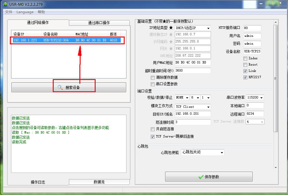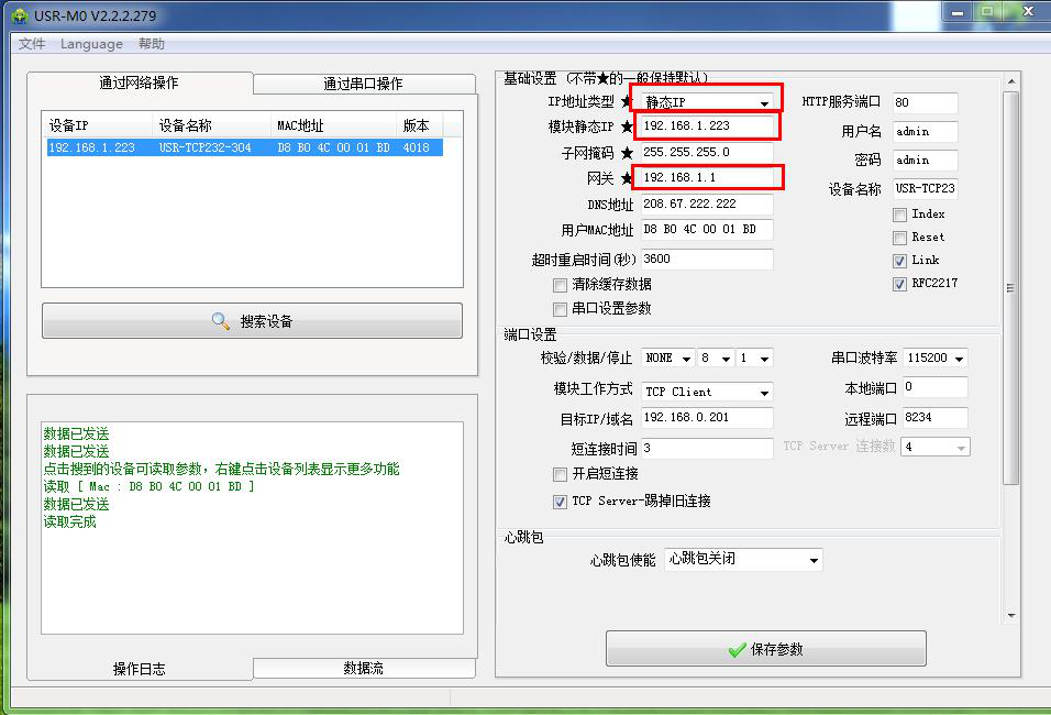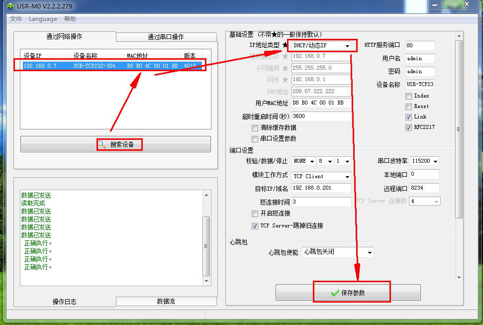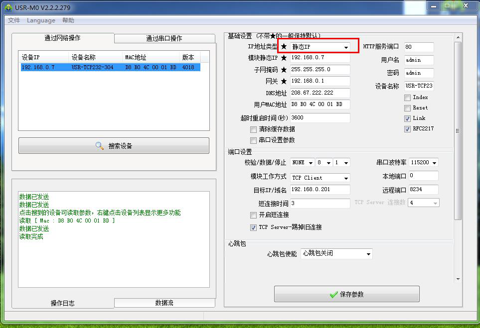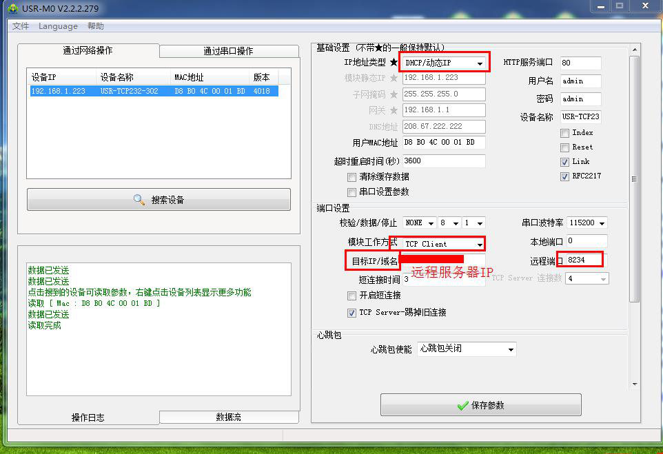 2、 用M0设置软件将304设置TCP client,目标IP填远程服务器地址。远程端口填远程服务器的端口号。