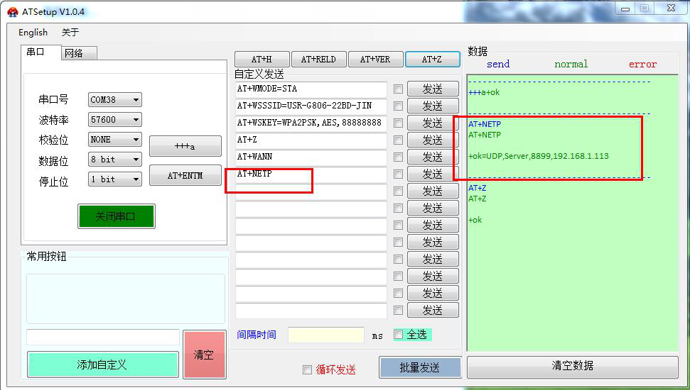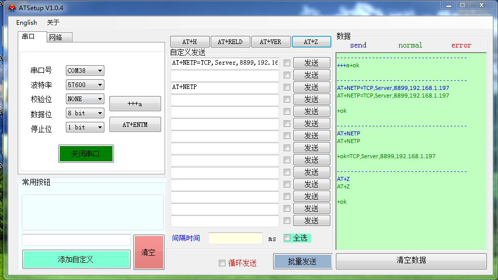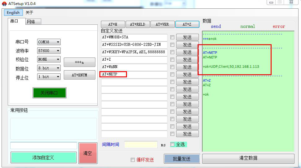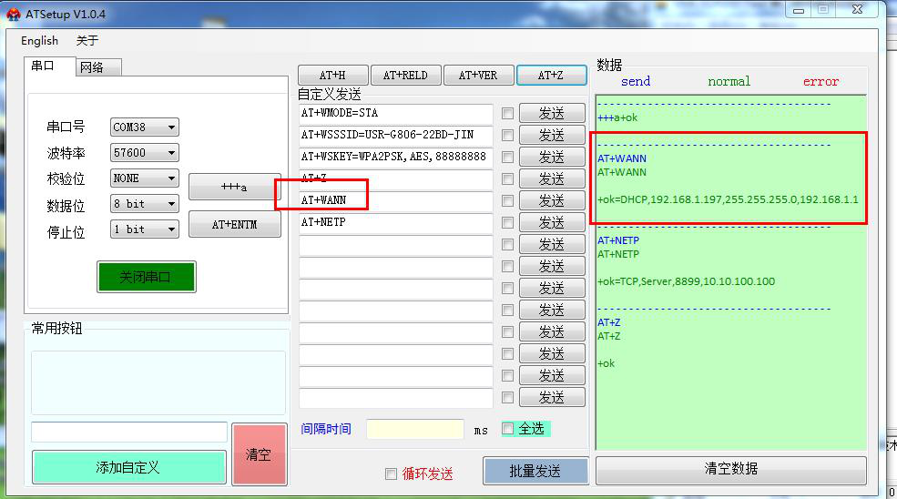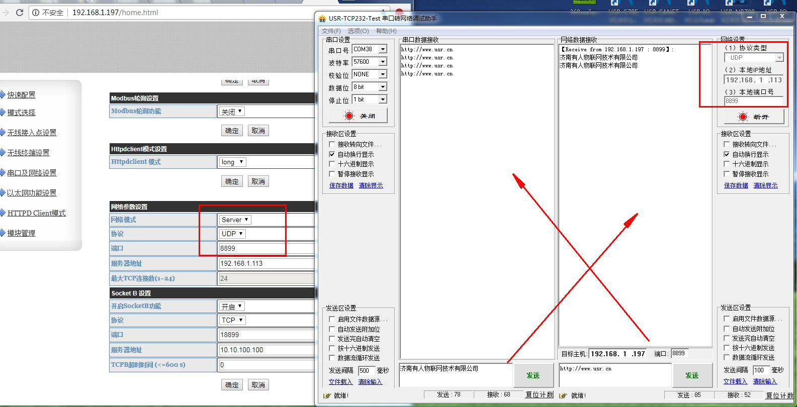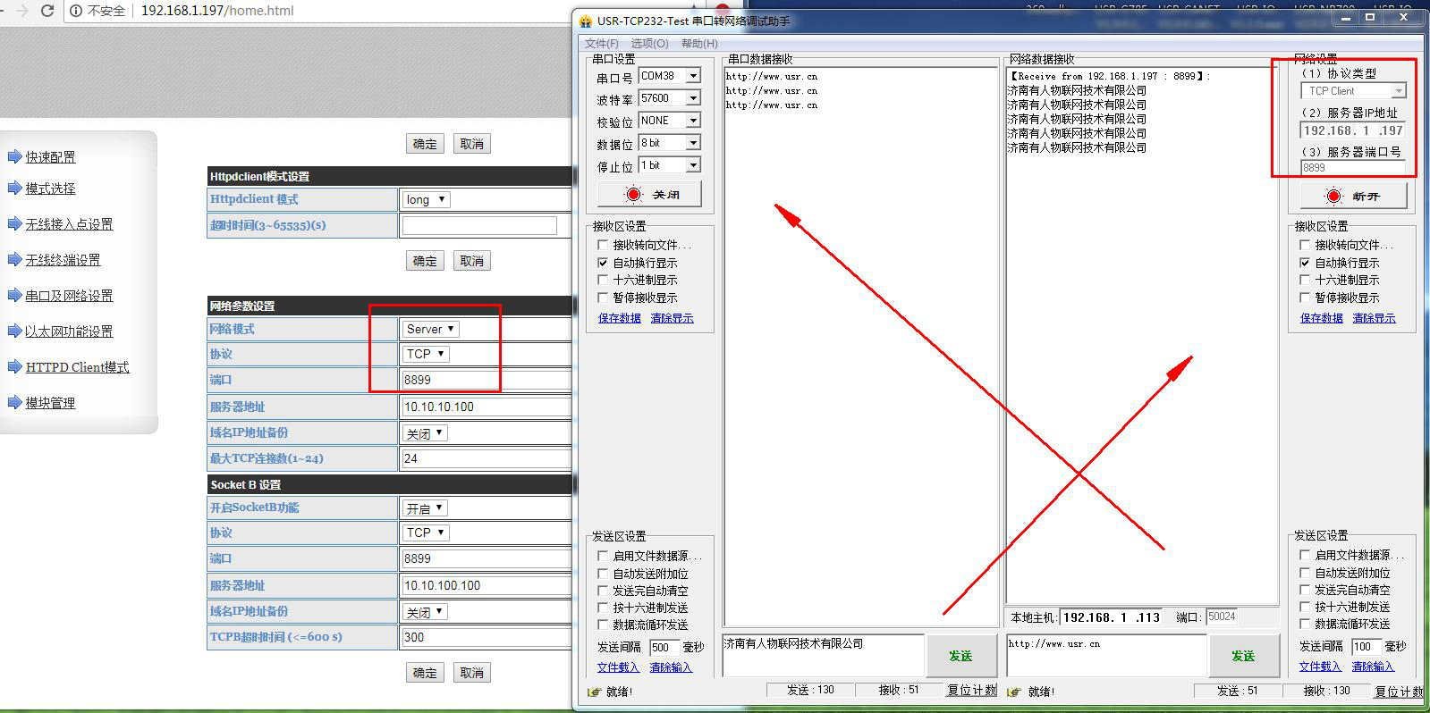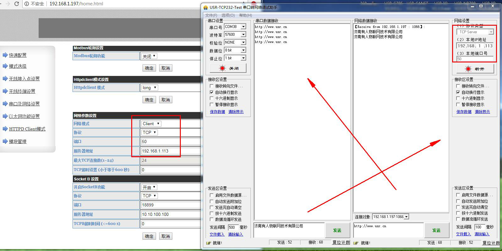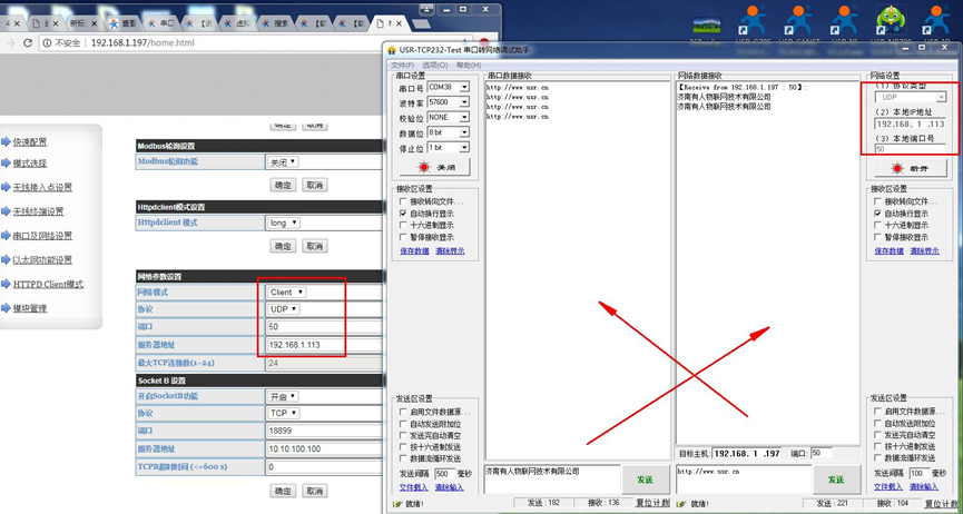 用USR-W610的IP 登录USR-W610的网页,然后修改W610的串口参数。测试4种工作模式下,串口和网络的数据透传。