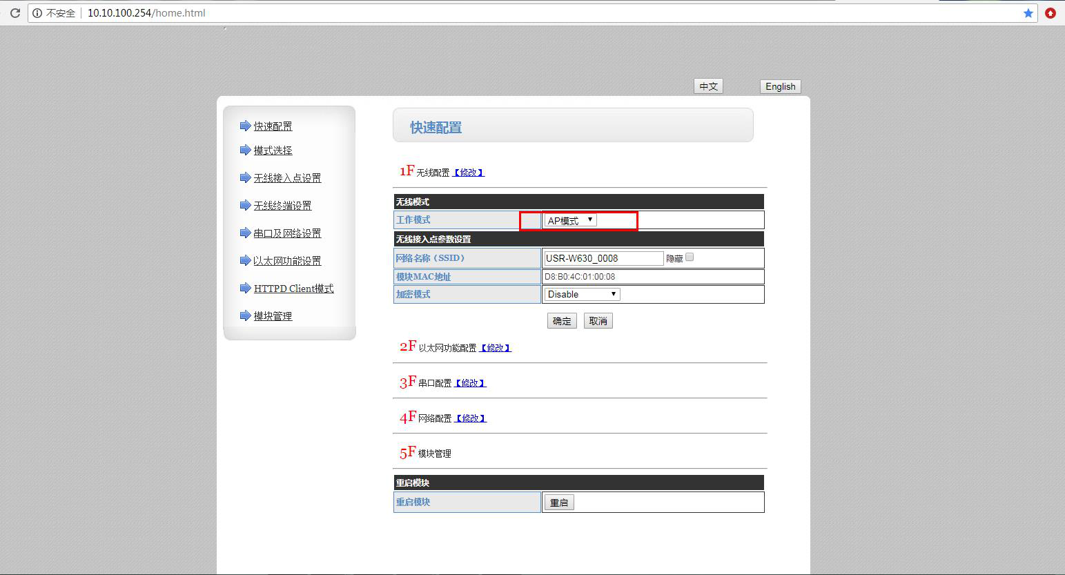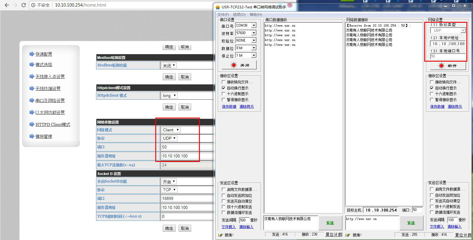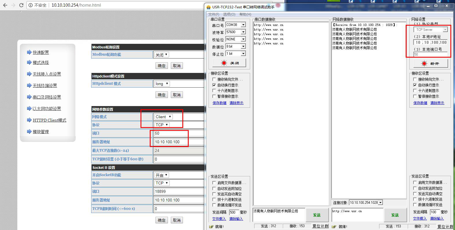用USR-W630的IP 10.10.100.254 登录USR-W630的网页,然后修改W630的串口参数。测试4种工作模式下,串口和网络的数据透传。