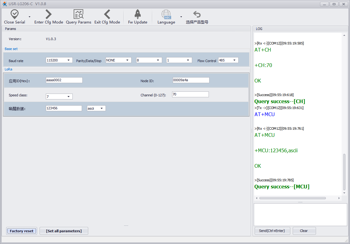 这里以有人LoRa终端USR-LG206-L-C为例。使用串口线连接LoRa终端的RS232接口与电脑,打开USR_LoRa软件(http://www.usr.cn/Down/USR_LoRa_SET-V1.0.8.rar),选择LG206-C。