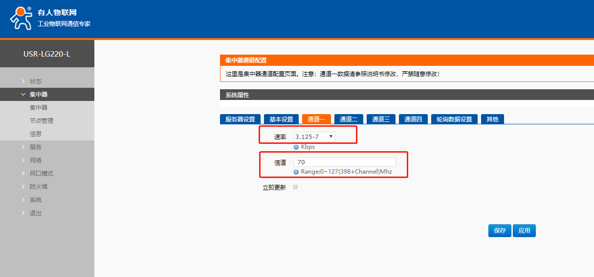 (5)设置集中器的信道和速率,依次点击集中器,通道一设置速率和信道和lora相同,点击保存应用,通道二、三、四中设置的速率与信道各不相同,且都与通道一不同。