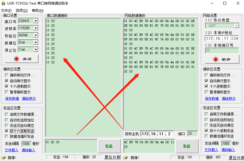 (7)查看集中器网口获取的IP号,小黄人软件的目标地址填写集中器ip与之前设置的集中器本地端口。