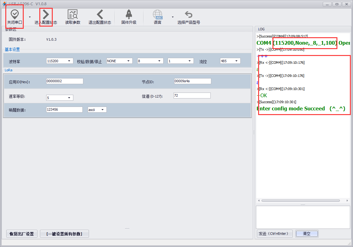 1、打开串口,进入配置状态,206-L-C默认参数:115200,N,8,1