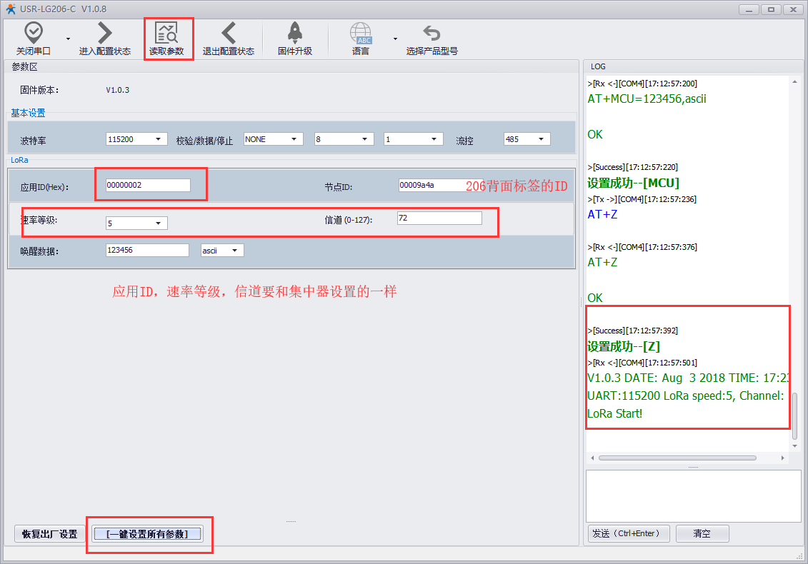 2、点击读取参数,设置参数,保证应用ID(可设),速率等级,信道要和集中器一样,节点ID在206背面的标签上。设置完成后一定不要忘一键设置所有参数。