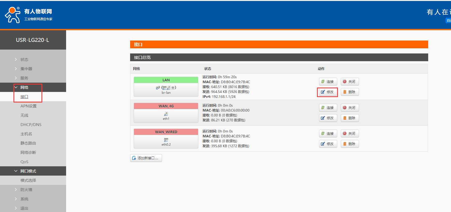 4、如果需要修改IP地址在网络接口,LAN位置进行修改