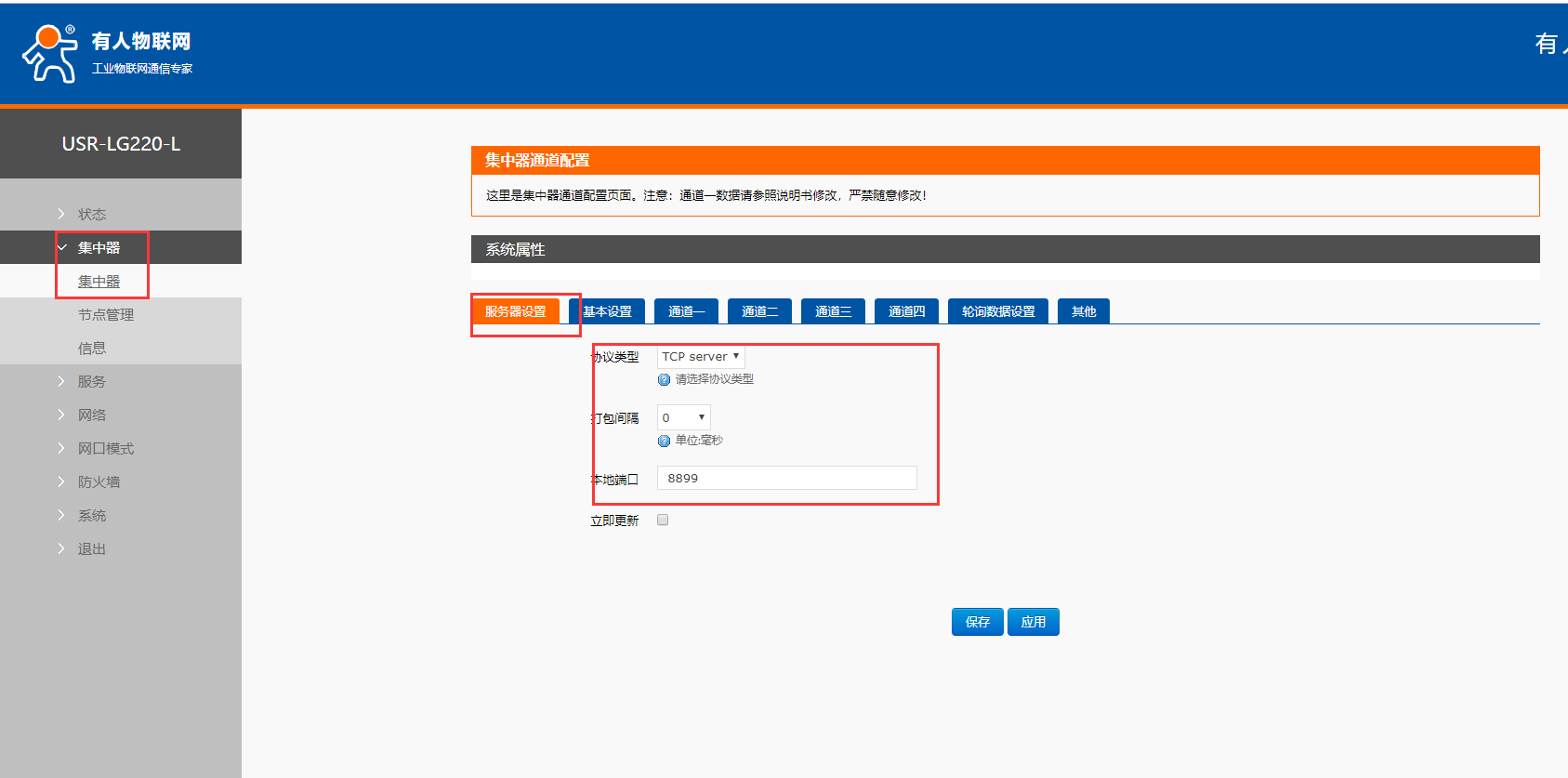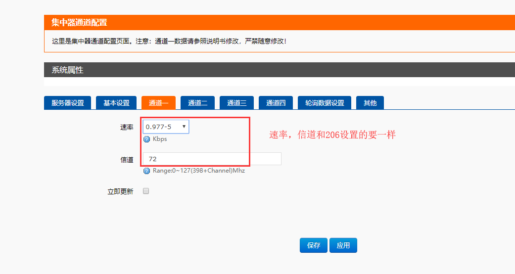 7、设置集中器的信道和速率,依次点击集中器,通道一设置速率和信道和lora相同,点击保存应用,通道二、三、四中设置的速率与信道各不相同,且都与通道一不同。