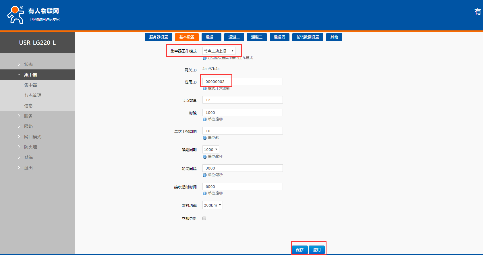6、设置集中器的应用ID,依次点击集中器,基本设置,应用ID(206设置的应用ID),设置应用ID和lora相同。最后保存应用。工作模式以节点主动上报为例。