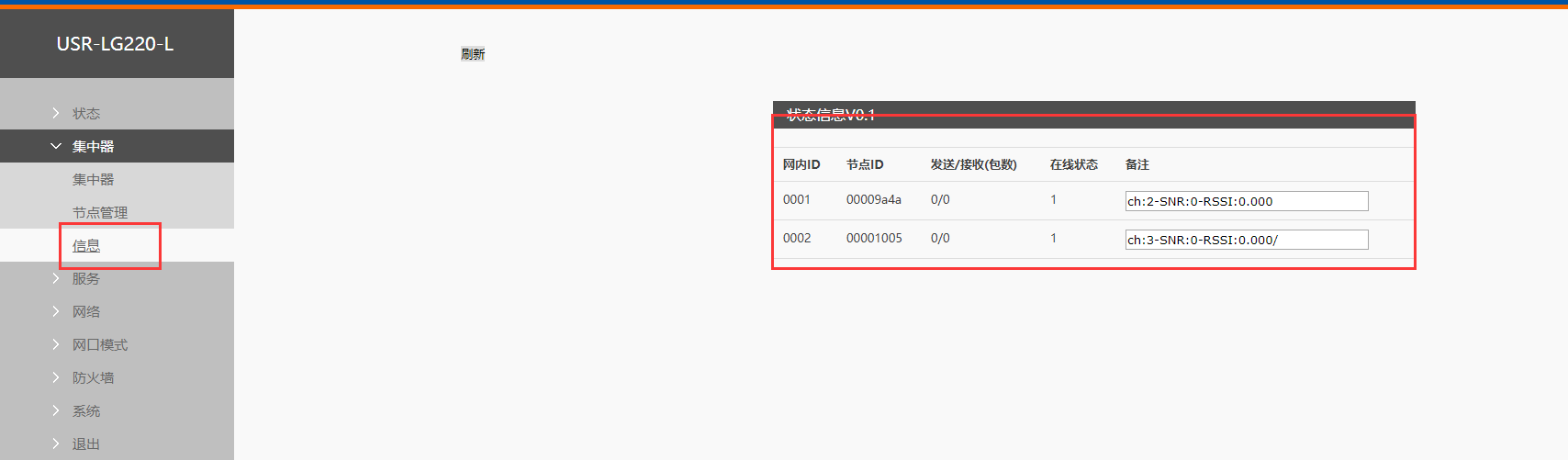 9、重启完毕登陆集中器在集中器—信息 可参看加入的节点信息,串口助手会显示连接对象ip与端口号。