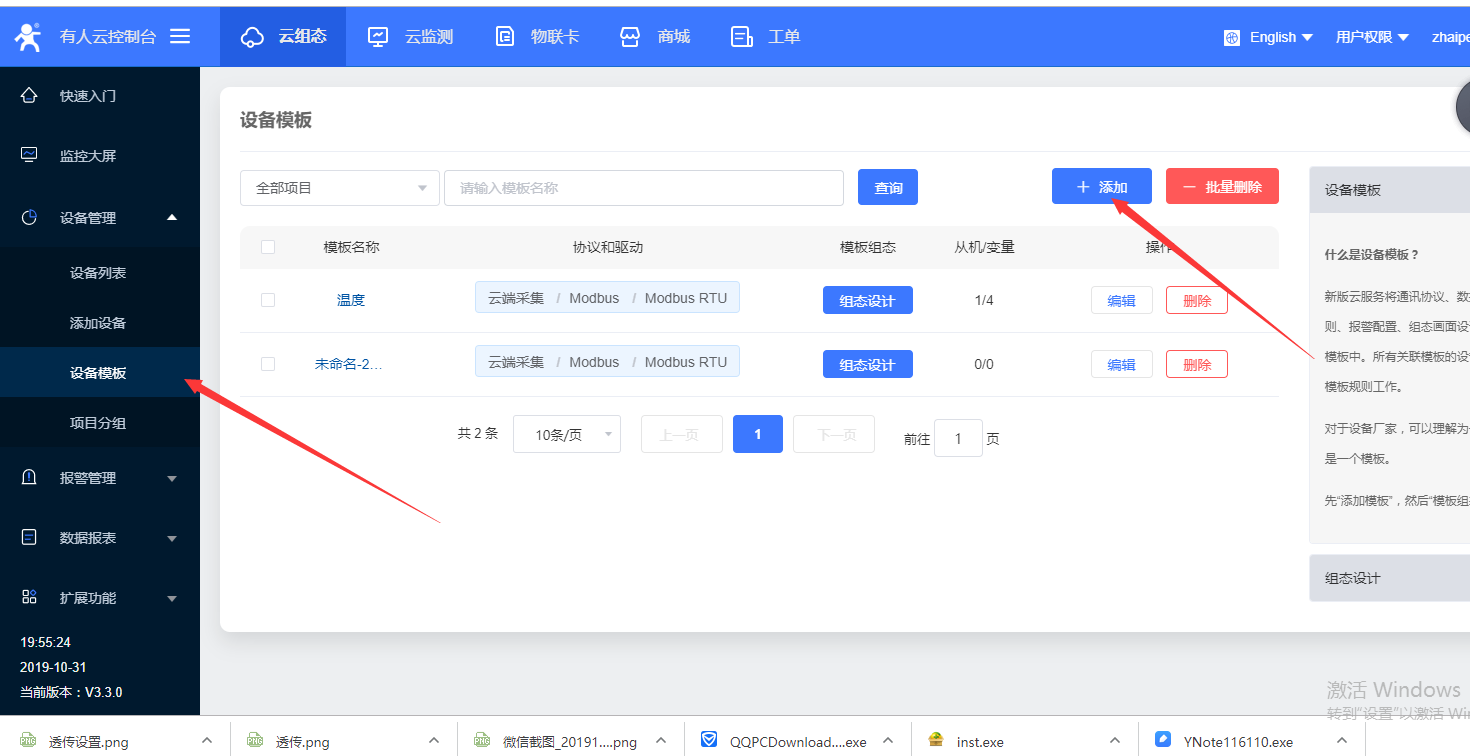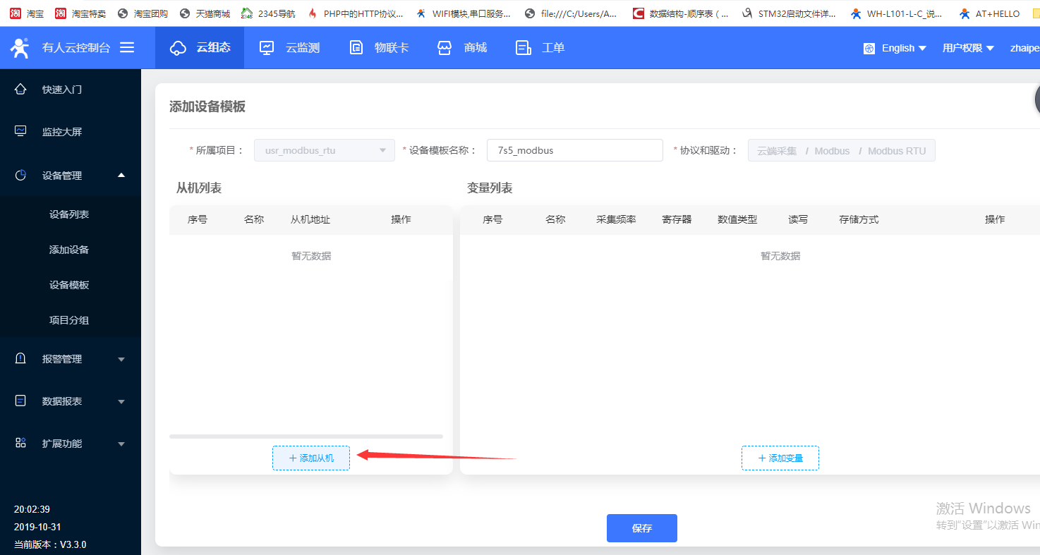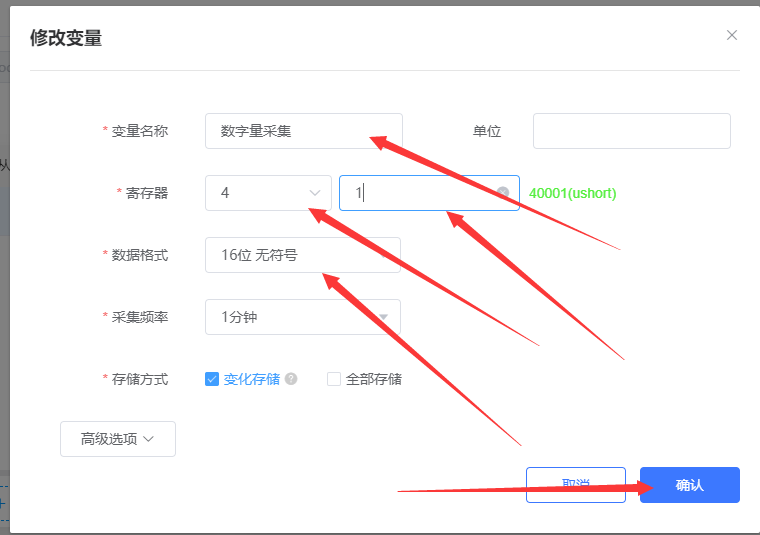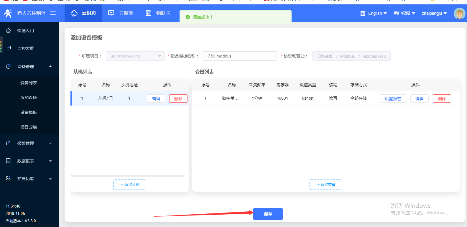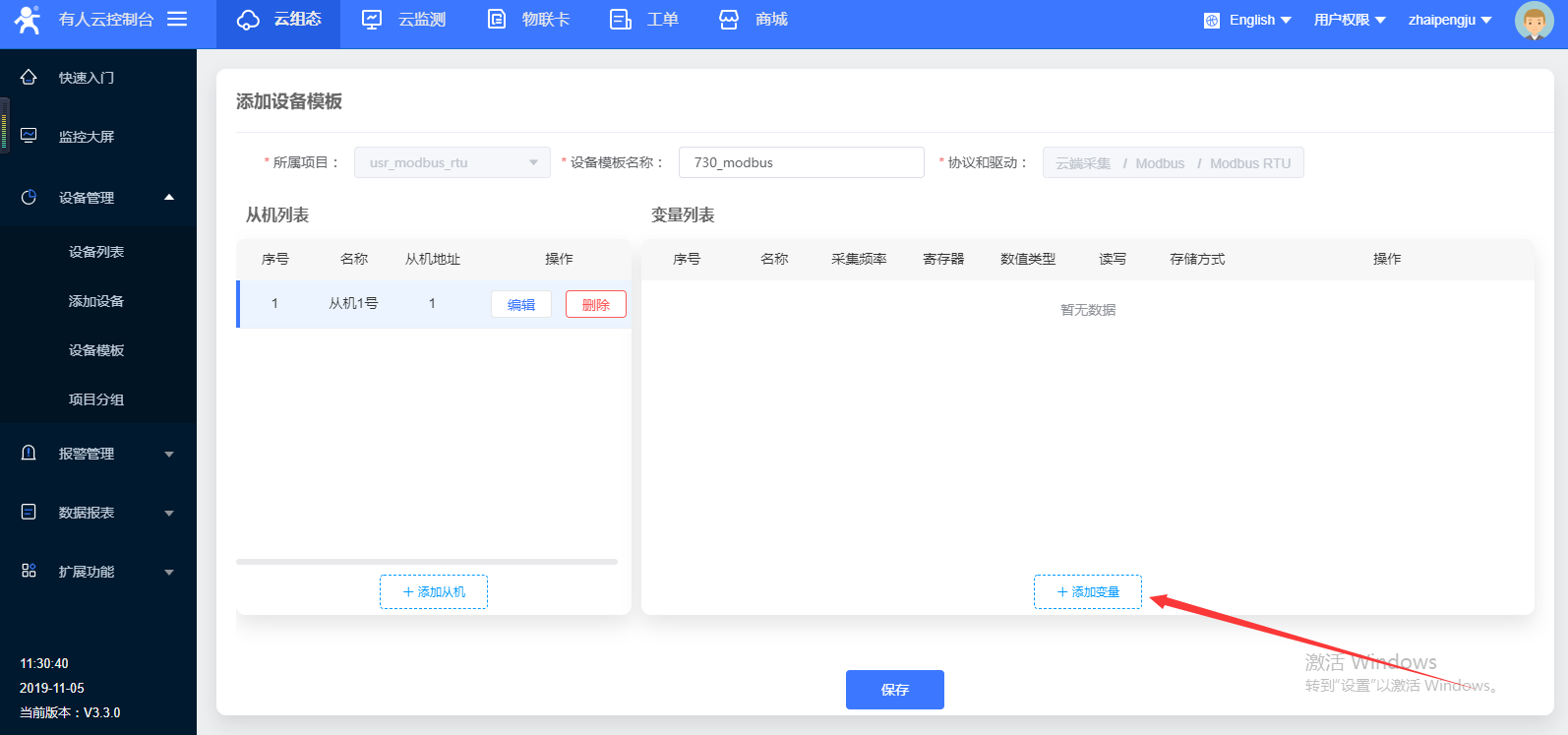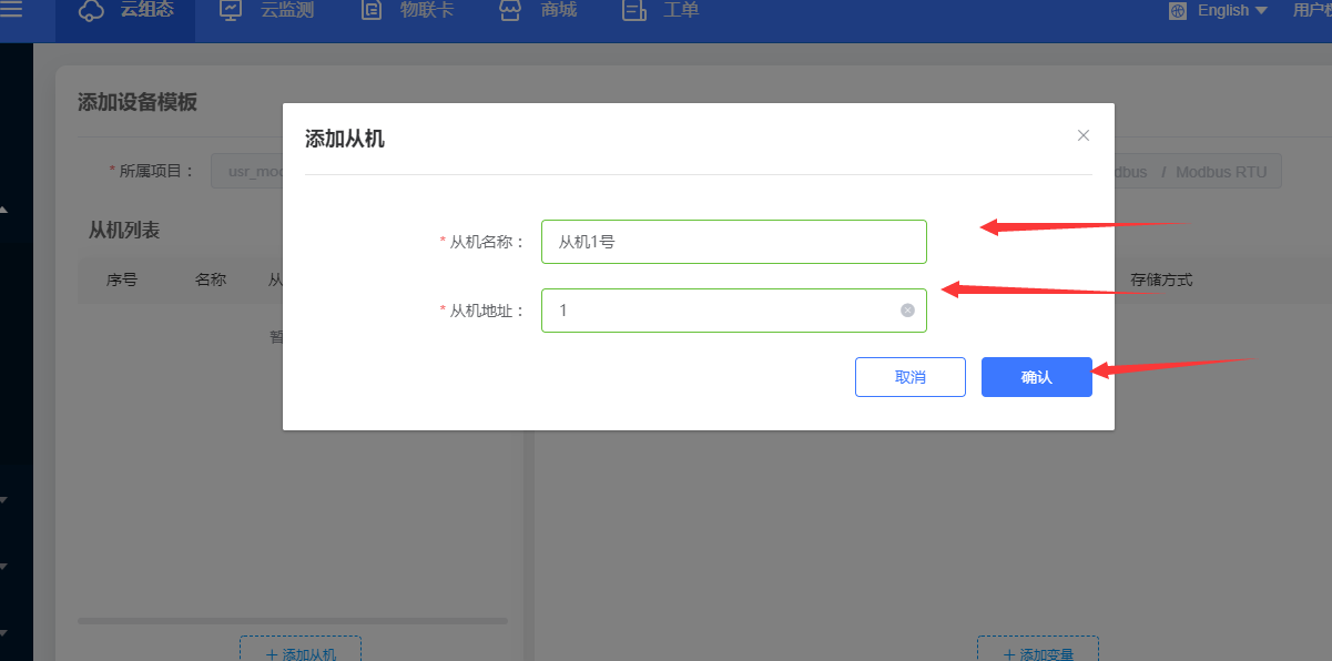 2. 点击设备模板,然后点击添加,开始添加设备模板。如图2(1);在打开的页面中所属项目选择刚才创建的项目,设备模板名称这里命名为730_modbus,协议和驱动一栏选择云端采集——modbus rtu,点击下一步,配置从机和变量如图2(2);点击添加从机如图2(3);这里从机名称命名为从机1号,从机地址填写为1,然后点击确定,这里的从机地址就是modbus协议中的从机设备号如图2(4);点击添加变量如图2(5);这里为变量命名为数字量采集,寄存器类型选择为4(关于寄存器类型选择参看步骤2结尾说明部分),数据格式选择16位无符号,采集频率设置为一分钟,如图2(6);最后点击保存如图2(7)。
