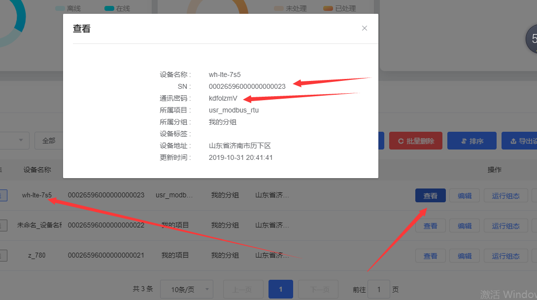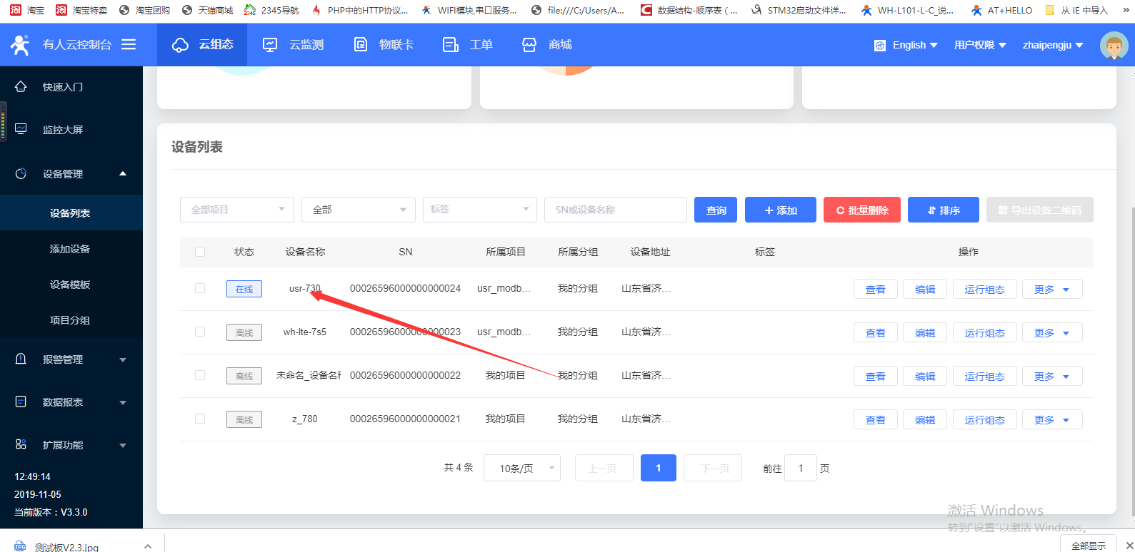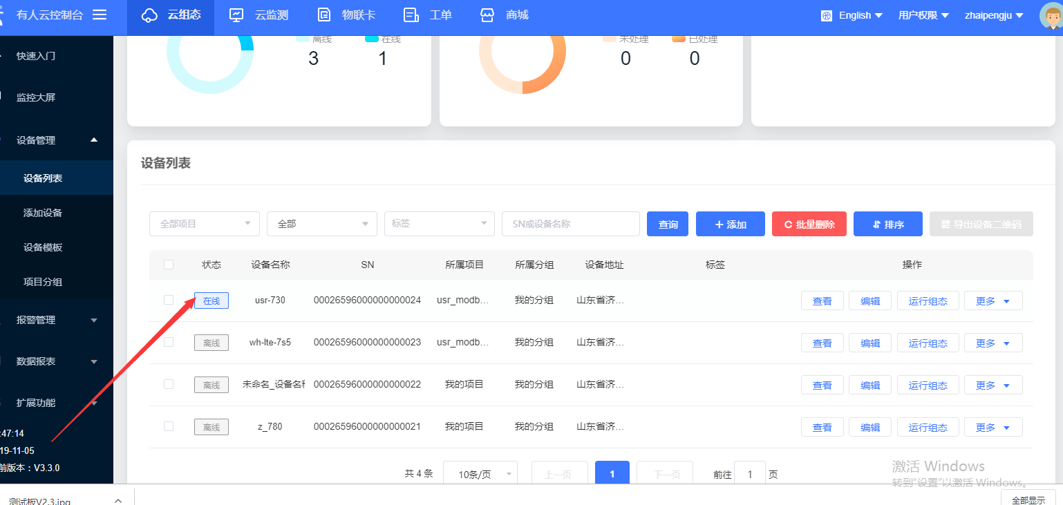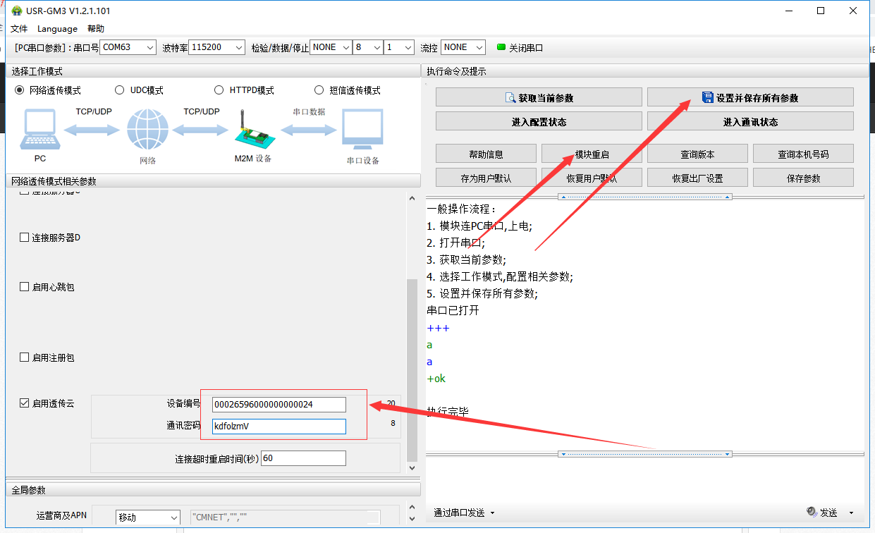 4. 打开 730 的配置软件,电脑串口连接 730,点击打开串口,勾选连接服务器 A,地址填写 clouddata.usr.cn,端口 15000,勾选启用透传云,设备号与密码填写图 4(2) 中的设备号与密码,填写完成后选择进入配置状态,待 730 串口返回 ok 之后,点击设置并保存所有参数,待所有参数配置完成之后,点击模块重启,使参数生效。如图 4(1),此时我们可以看到透传云端的设备已经上线了,如图 4(3)。