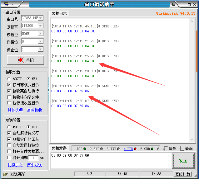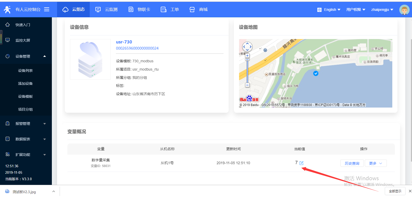 5. 打开配置软件,将接收调整为16进制接收,可以看到有人云下发的指令:01 03 00 00 00 01 84 0A,这时候我们根据modbus协议上传一组数据:01 03 02 00 07 F9 86 ,如图5(1)。点击设备,来到如图5(2)界面用来查看数据,我们可以看到当前数值变为7如图5(3)。