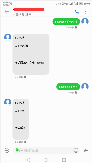 编辑短信 root#AT+COMMAND 到 SIM,其中root是命令密码, COMMAND 是 AT 指令的具体指令,发送具体格式如图: