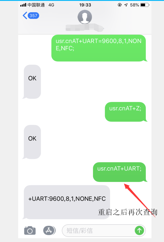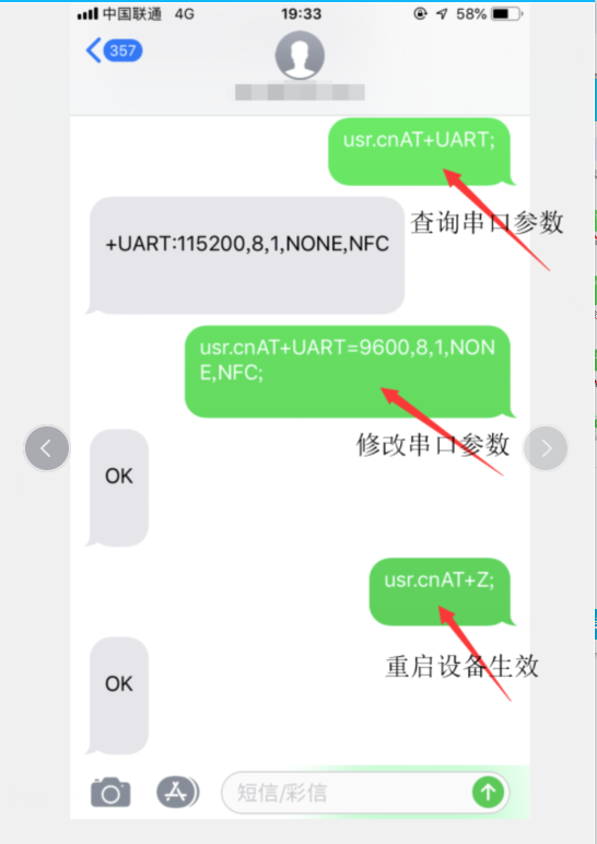 2.通过手机发送固定格式的短信给DTU内的手机号。短信AT指令格式:命令密码+AT指令,命令密码出厂默认是usr.cn。注意:AT指令后面要加英文分号和回车换行,本例以修改DR504的串口参数为例。如图2所示