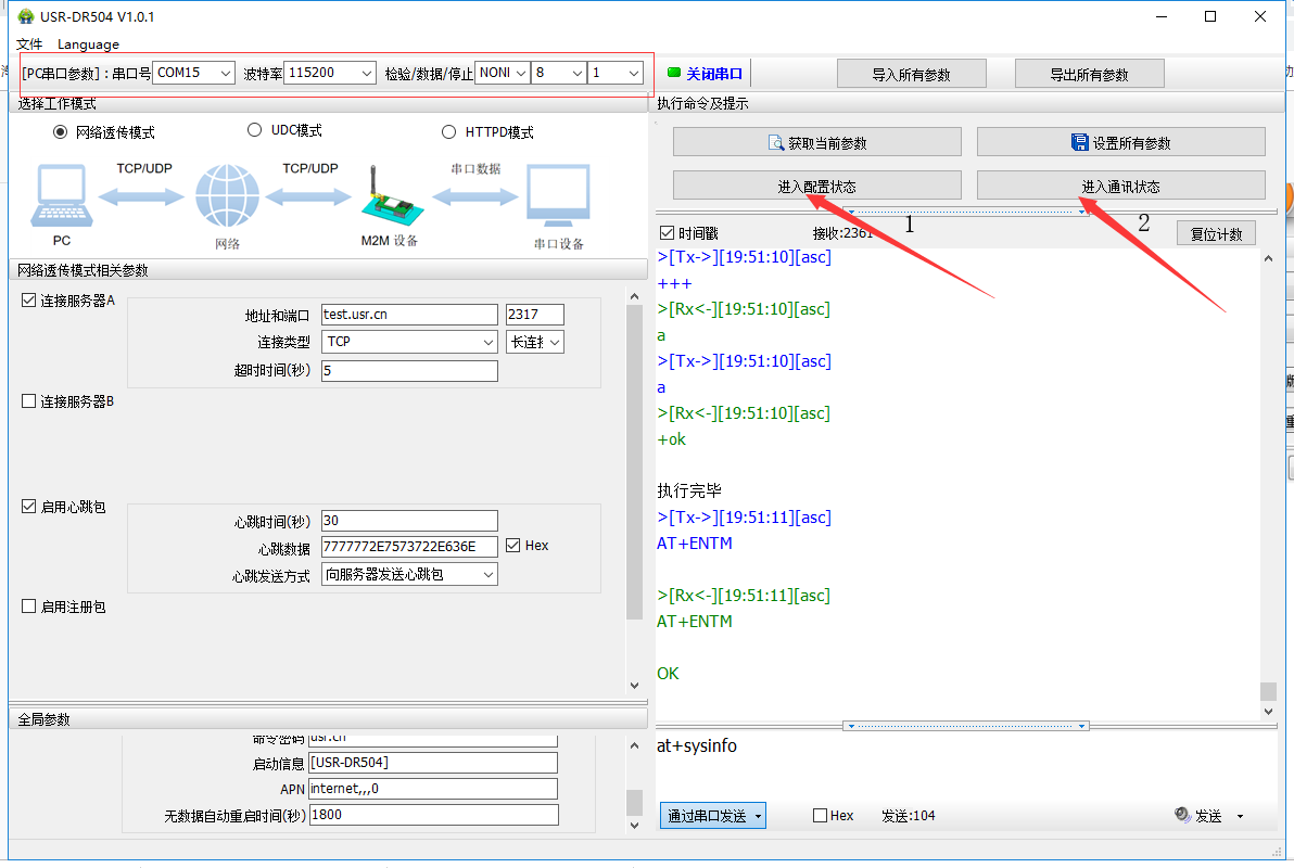 若出现无法进入at指令配置状态(点击进入配置状态不返回ok)的现象检查: