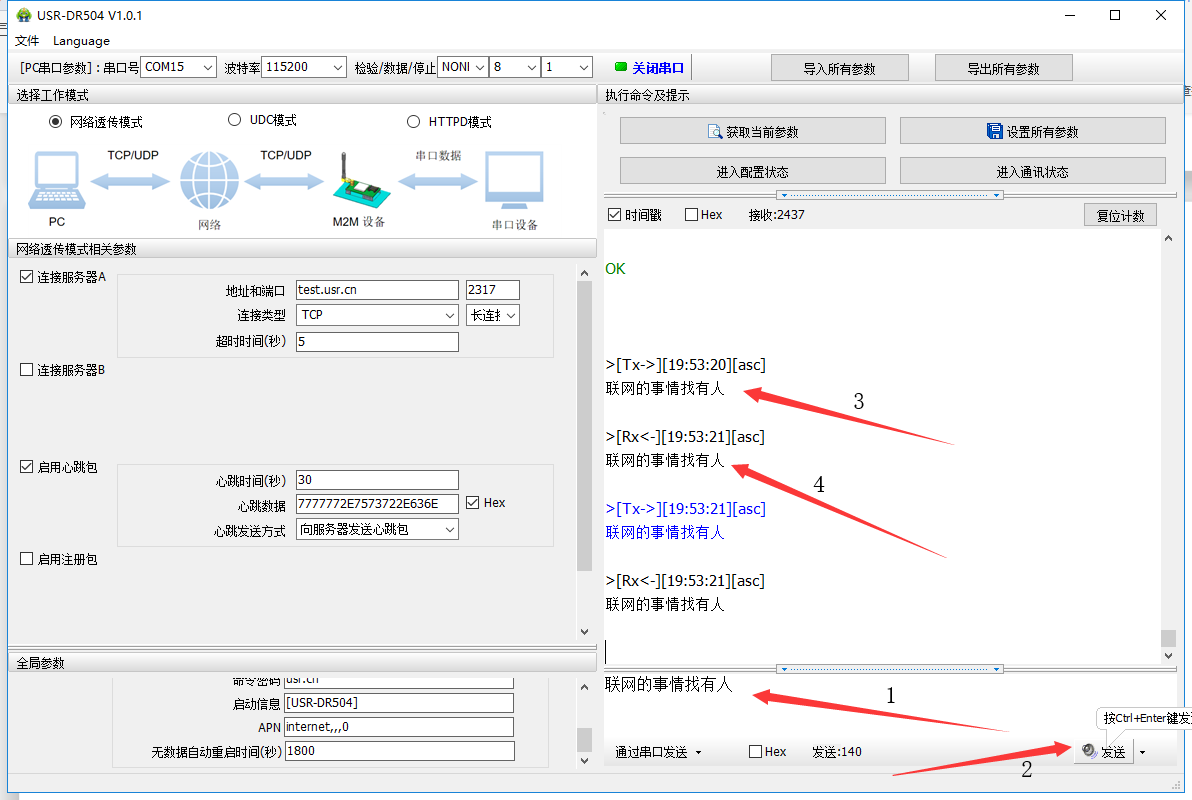 5.DTU出厂默认连接的是我司的测试服务器:test.usr.cn:2317;串口向服务器发送什么数据,服务器就将接收到的数据返回到串口。通过串口发送<联网的事情找有人>,可以看到服务器返回了相同的内容,说明DTU工作是没有问题的。如图5