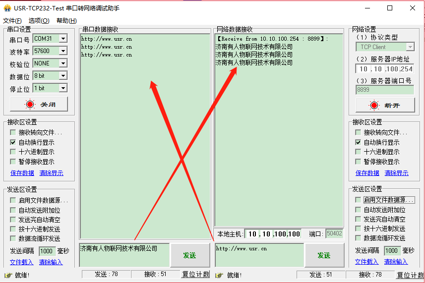 模拟数据收发测试,在实际应用中,串口应接在设备上,且模块的串口参数与串口设备的参数一致。